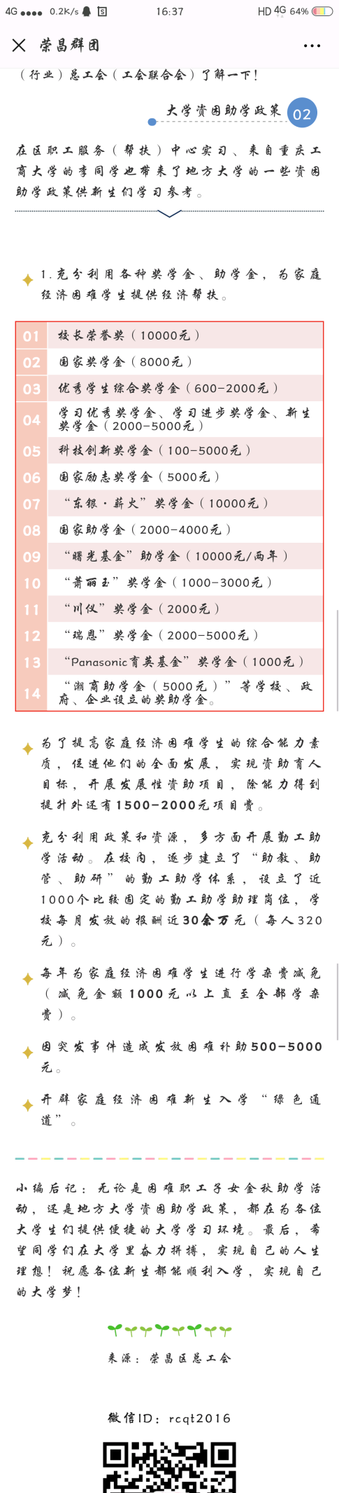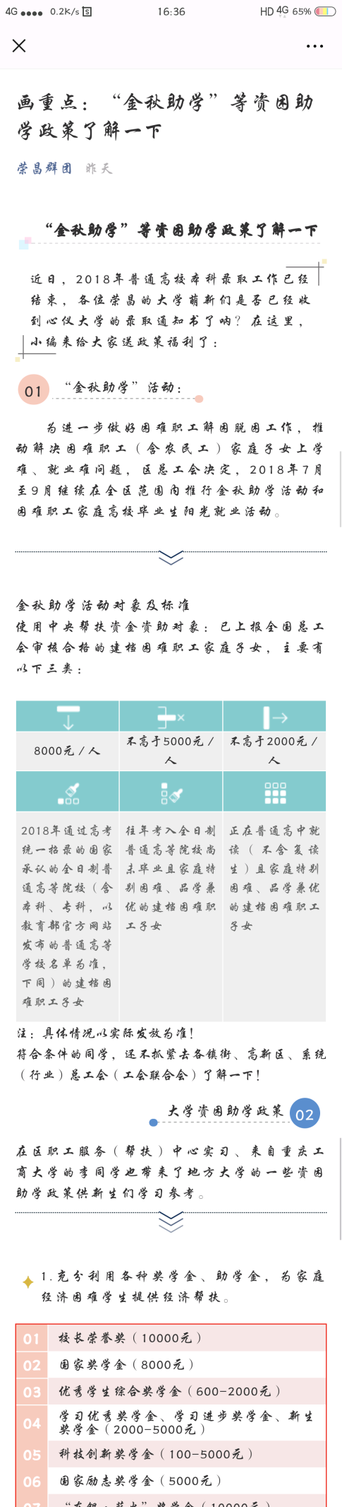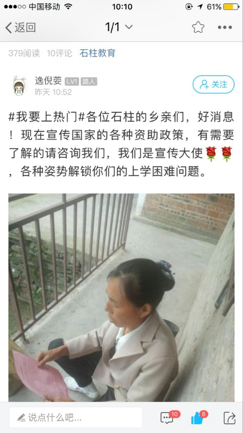 当前位置: 首页 >> 学工新闻 >> 正文 ok138cn太阳集团成功举办2018国家资助政策宣传大使“三进”活动 时间:2018年10月22日 13:55 作者: 为贯彻落实十九大精神,深入推进扶贫工作,提升资助育人工作水平,不断实现精准资助发展目标,ok138cn太阳集团根据教育部全国学生资助管理中心《关于组织国家奖学金获奖学生担任“学生资助宣传大使”的通知》文件精神,成立了以品学兼优的贫困学生为代表的国家助学金资助政策宣传活动小组。宣传小组利用暑假返乡的机会,进母校、进村社、进社区宣传介绍国家资助政策,分享自己如何在好政策的帮助下安心学习、成长成才的励志故事。 ok138cn太阳集团为此次宣讲活动制定了详细的活动方案,成立了专门的领导小组,被选为资助宣传大使的同学们在思想上高度重视,保证宣传工作切实、顺利地开展。宣讲小组分别进入河南省新乡、甘肃省平凉、四川省宜宾、重庆市丰都、石柱、江北、南川、垫江、荣昌等区县,结合当地实际情况,宣传国家学生资助政策,不断加强对家庭经济困难学生资助宣传力度,激励家庭经济困难学生克服困难、自强自立、努力成才,推动教育事业科学发展。 (一)走访贫困户,精准宣传 各资助小组通过走访当地农户,点对点地进行我校政策讲解;通过与学生家长的交流,解释与讲解国家资助政策,消除他们心中 “没钱就上不了大学”的担忧。 垫江小组走访垫江县永平镇贫困户 四川小组走访四川省宜宾县贫困户 江北小组走访贫困户 南川小组走访南川福寿镇贫困户 (二)联合区县资助中心,走进社区宣传 宣传大使们回到区县,通过联系区县资助中心与工作人员一起进行宣传。一方面配合区县资助办工作人员的宣传工作,在区县资助办为前来咨询的学生答疑解惑,并介绍我校资助政策,消除学生们心中的疑惑;另一方面与工作人员一起走进社区进行宣传:利用区县资助办的信息与资源优势,在所在地社区宣传国家与我校资助政策,为居民答疑解惑,解决实实在在的问题。 南川小组在南川区资助中心进行志愿者服务 丰都小组在丰都县资助中心进行志愿者服务 (三)资助大使回母校宣传 高中生是未来的大学生,是最需要了解国家资助政策的人,因此各宣传小组将重点放在当地学校中,纷纷走进学校进行集中宣传。 四川小组在宜宾二中进行资助政策宣传 垫江小组在垫江一中进行资助政策宣传 荣昌小组在荣昌中学进行资助政策宣传 (四)创新宣传方式,利用网络自媒体,进行广泛宣传 石柱小组在石柱生活网上宣传答疑 南川小组通过建立QQ群、微博、微信等方式宣传答疑 荣昌小组通过荣昌区总工会微信公众号宣传 “学生资助宣传大使”是光荣更是责任,被记录的不仅仅是ok138cn太阳集团 “学生资助宣传大使”宣讲小组执行暑期任务的工作缩影,更是他们以不同的方式去展现国家与学校对同学的关怀与帮助,以实际行动展现出当代优秀大学生应有的责任与担当。学生资助宣传大使作为资助政策的受益者,为让更多的学子看到黯然天空里的盈盈亮光,深入家乡向每一位学子传播资助政策,让祖国未来的栋梁不会因为遭受点滴挫折而封埋自己的梦想,点亮每一盏希望的心灯,为未来逐梦扬帆助力。 上一条:我校举办大学生互联网金融风险防范宣传教育系列活动 下一条:我校辅导员获教育部表彰 【关闭】