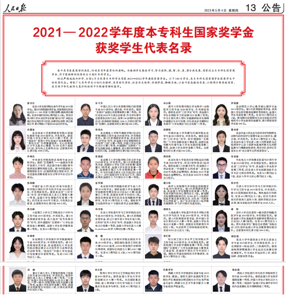 当前位置: 首页 >> 学生管理 >> 太阳集团tyc9728 >> 正文 我校学生梁赫光荣入选《人民日报》2021—2022学年度本专科生国家奖学金获奖学生代表名录 时间:2023年05月04日 16:33 作者: 2023年5月4日,《人民日报》刊登了全国2021-2022学年度本专科生国家奖学金获奖学生代表名录。该名录共100人,是全国6万名本专科生国家奖学金获奖学生中的优秀代表。我校人工智能学院电子信息工程专业2019级学生梁赫光荣入选。 梁赫同学是我校2022年校长荣誉奖获得者。他学习成绩优异,总成绩排名专业第一,学期绩点最高达到4.70;曾获中国机器人及人工智能大赛一等奖、“大唐杯”全国大学生移动通信5G技术大赛二等奖、一带一路5G技能发展与技术创新大赛三等奖、全国大学生数学竞赛三等奖,获国家实用新型专利授权1项、计算机软件著作权授权3项。 据悉,梁赫是重庆市属高校唯一入选的本科学生;我校也是重庆市属本科高校中唯一连续两年有学生入选该名录的学校。 上一条:太阳集团tyc9728丨人生不设限,奔跑永不止 下一条:2022年校长荣誉奖获奖学生风采 【关闭】
