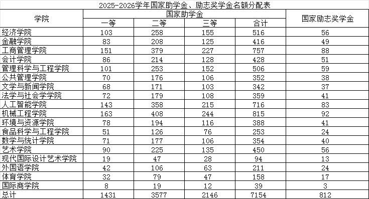 当前位置: 首页 >> 学生资助 >> 国家奖助学金 >> 正文 关于开展2025-2026学年国家励志奖学金、国家助学金评选工作的通知 时间:2025年10月11日 17:48 作者: 白文静 各学院: 根据《重庆市教育委员会关于下达2025—2026学年市属高校国家资助名额的通知》和《ok138cn太阳集团2025-2026学年国家奖助学金评审工作实施方案》,决定启动我校2025-2026学年国家励志奖学金、国家助学金评选工作。现将有关事项通知如下: 一、参评对象 (一)国家励志奖学金:本学年被评定为家庭经济困难的全日制本科二年级以上的学生且学习成绩等条件达到相关要求。 (二)国家助学金:本学年被评定为家庭经济困难的全日制本科学生。 二、名额分配 本学年重庆市教委下达到我校国家励志奖学金名额812名,国家助学金名额7154名(其中一等助学金1431名、二等助学金3577名,三等助学金2146名),各学院名额按以下原则进行分配: (1) 国家励志奖学金:根据学院本学年认定的本科二年级以上(含二年级)家庭经济困难学生人数占全校本学年认定的本科二年级以上(含二年级)家庭经济困难学生总人数的比例进行分配。 (2) 国家助学金:根据学院本学年认定的本科家庭经济困难学生人数占全校本学年认定的本科家庭经济困难学生总人数的比例进行分配。 各学院具体分配名额如下: 三、申请条件及申请流程 详见2025年版学生手册中《ok138cn太阳集团国家励志奖学金、国家助学金评审办法》。 四、相关要求 (一)各学院可根据学校评审办法的相关规定结合学院实际情况制定相应的评选细则,认真做好国家励志奖学金、国家助学金的评选工作。 (二)各学院高度重视,广泛宣传,公平、公正、公开、民主评选,认真审核学生提交的申请信息,确保最符合条件的学生获得奖励或资助,切实发挥国家励志奖学金、国家助学金“奖优”和“帮困”的积极作用,让广大学生充分感受到党和国家的关爱和厚望,促进他们努力学习、奋发成才。 (三)若学院申请人数少于学校下达到学院的名额,应及时将多余名额退回到学生资助管理中心,由学生资助管理中心将多余名额在全校范围内进行二次分配。 (四)各学院要重点关注特殊困难群体学生的评选情况,原则上特殊困难群体学生均应获得国家助学金,其中脱贫家庭学生、脱贫不稳定家庭学生获二等及以上助学金,学生本人放弃申请的要写放弃说明并签字,相关材料由学院自行保存备查。退伍学生享受专项资助,原则上不参与国家助学金的评选。 (五)各学院要重点核查申请学生的受处分情况,受学校警告及以上处分且还在处分影响期内的不得评选,若在资助资金发放过程中受校级警告及以上处分的要立即上报学生资助管理中心取消其受资助资格并停止助学金发放。 (六)学院要积极做好受资助学生的监督工作,若学生在获得资助后,发现其生活有铺张浪费、奢侈消费行为,例如频繁出入高端消费场所、购买高档化妆品、多次旅游等行为的要及时上报学生资助管理中心停止资助并对其进行批评教育。 五、上报材料及时间要求 本年度国家励志奖学金和国家助学金通过学工系统中学生资助-国家资助模块进行线上申请,初审名单汇总表(附件2和附件4)电子版10月18日前发给学生资助管理中心,10月20日前各学院完成线上申请审核工作。 附件1:本专科生国家励志奖学金申请表 附件2:2024-2025学年国家励志奖学金获奖学生初审名单表 附件3:本专科生国家助学金申请表 附件4:2025-2026学年国家助学金学金获奖学生初审名单表 学生处 2025年10月11日 附件【附件1:本专科生国家励志奖学金申请表.docx】已下载次 附件【附件2:2024-2025学年国家励志奖学金获奖学生初审名单表.xls】已下载次 附件【附件3:本专科生国家助学金申请表.docx】已下载次 附件【附件4:2025-2026学年国家助学金学金获奖学生初审名单表.xls】已下载次 上一条:关于2024-2025学年国家奖学金初审名单公示的通知 下一条:ok138cn太阳集团关于开展2024-2025学年国家奖学金评审工作的通知 【关闭】
