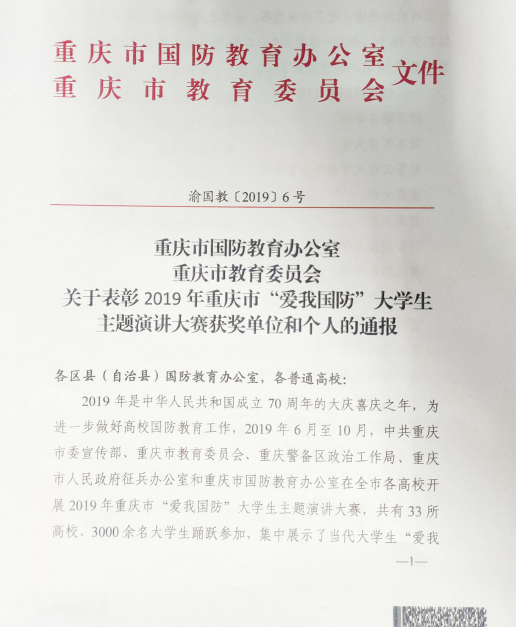 当前位置: 首页 >> 国防教育 >> 国防教育网 >> 正文 喜讯!我校荣获“爱我国防”大学生主题演讲大赛优秀组织奖 时间:2020年01月16日 16:01 作者: lyp95 按重庆市委宣传部、重庆市国防教育办公室、重庆市教委等五家单位要求,我校党委武装部承办了2019年重庆市“爱我国防”大学生主题演讲大赛复赛和决赛,重庆市有33所高校选送了81名选手参赛。整个工作组织得力、协调顺畅、保障精细、成效显著,确保了大赛的公平公正性,有力促进参赛选手水平发挥,在重庆市高校中掀起了国防教育的热潮,得到主办单位、各位评委专家和其他参赛兄弟院校的一致赞誉。 近日,重庆市国防教育办公室和重庆市教委联合发文通报表彰在大赛中表现突出的单位和个人。我校荣获2019年重庆市“爱我国防”大学生主题演讲大赛优秀组织奖,潘焱、杨娟两位教师被表彰为优秀指导老师。 ok138cn太阳集团高度重视国防教育,成立武装部,主动接受转业退伍军人到校加强国防教育工作,组建大学生民兵连,积极开展全民国防教育日、学生军训、应征入伍、慰问退伍军人、参观红色教育基地、观看70年大阅兵等活动,极大地激发了大学生崇军尚武情怀,筑牢关心国防、热爱国防、建设国防、保卫国防的共识和自觉行动,让红色基因厚植心底,代代相传。 上一条:关于组织开展2020年“红岩杯”重庆市兵棋推演挑战赛的通知 【关闭】