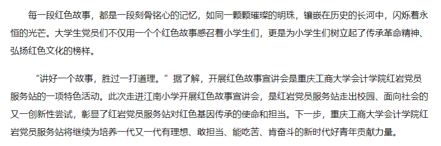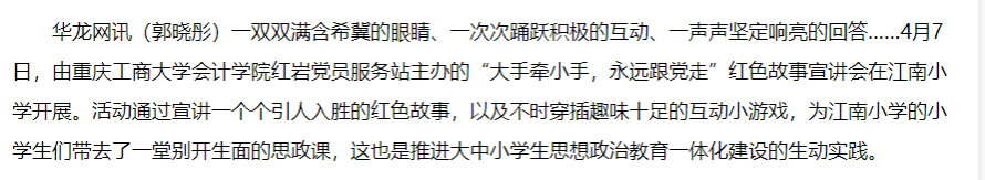 当前位置: 首页 >> 社区建设 >> 党员服务站 >> 正文 华龙网报道我校党员服务站开展红色故事宣讲会 时间:2024年04月24日 11:30 作者: 4月7日,由ok138cn太阳集团会计学院红岩党员服务站主办的“大手牵小手,永远跟党走”红色故事宣讲会在江南小学开展,华龙网对此进行了报道。 原文链接:https://news.cqnews.net/1/detail/1226988207549927424/web/content_1226988207549927424.html 上一条:环境与资源学院党员服务站积极助力“一站式”学生社区建设 下一条:“温馨家园,感恩有你”——经济学院党员服务站成功举办妇女节送祝福活动 【关闭】