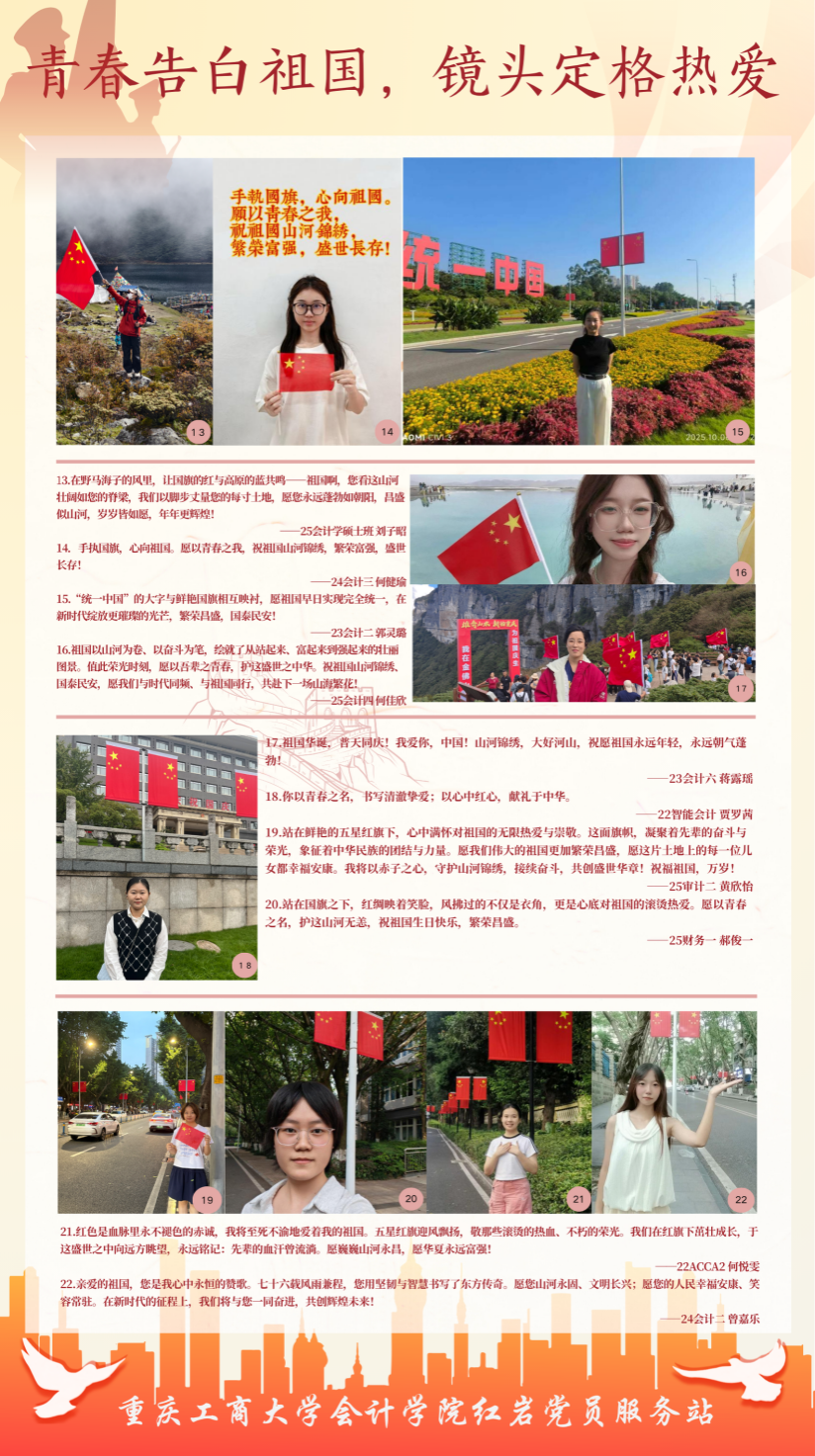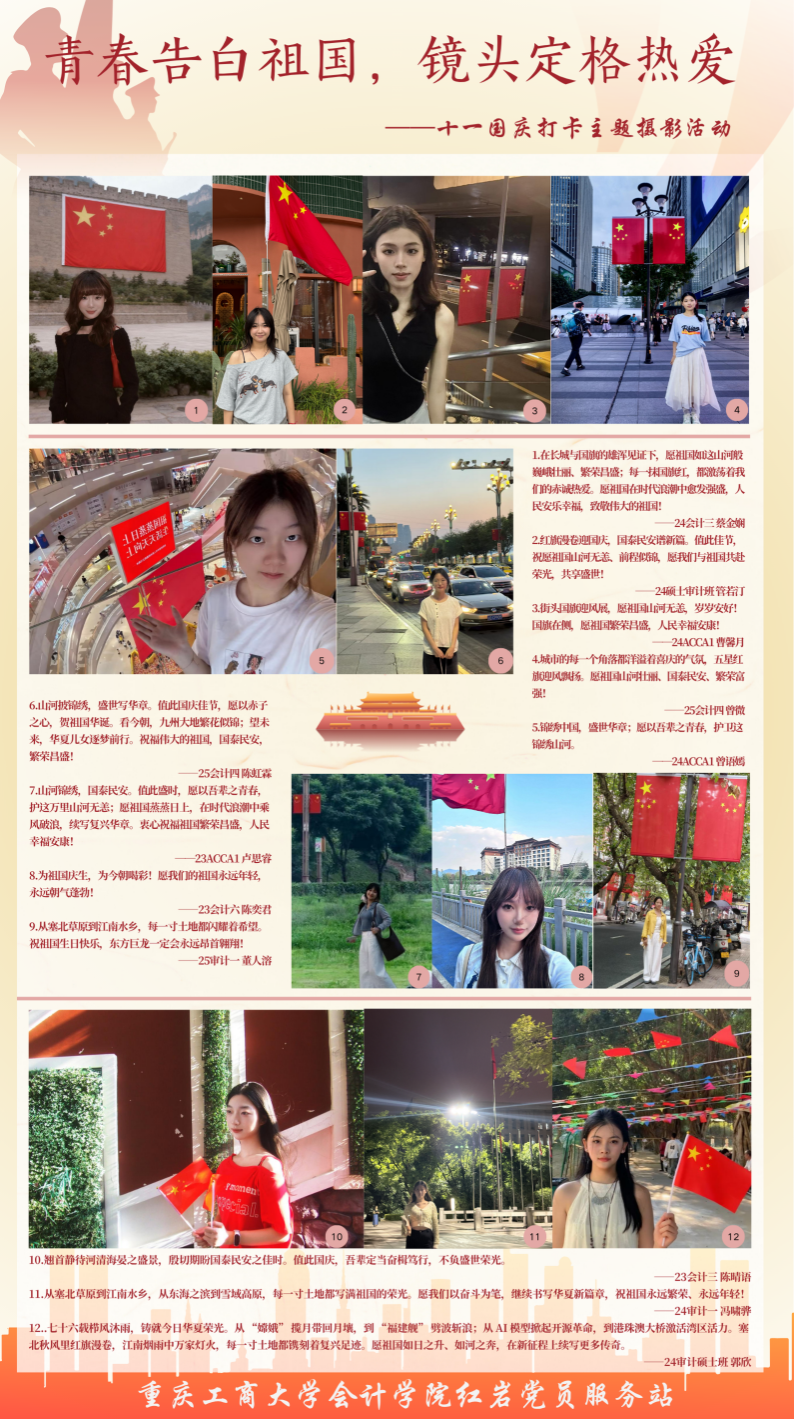 当前位置: 首页 >> 社区建设 >> 党员服务站 >> 正文 镜头映国韵,青春诉赤诚——会计学院红岩党员服务站开展国庆打卡主题活动 时间:2025年10月09日 14:49 作者: 会计学院党员服务站 金秋十月,山河锦绣。中华大地处处洋溢着喜庆氛围,我们共同迎来了中华人民共和国76周年华诞。在这个意义非凡的国庆佳节,为进一步激发青年学子的爱国热情,增强民族自豪感与使命感,会计学院红岩党员服务站精心策划并成功举办了“青春告白祖国,镜头定格热爱”十一国庆打卡主题摄影分享活动。 同学们满怀热忱参与其中,用相机定格国庆美好瞬间与对祖国的深情。接下来,就让我们透过镜头,一同感受这份炽热的家国情怀! 此次摄影分享活动,不仅是一场视觉的盛宴,更是一次深刻的爱国主义教育实践。每一张照片都承载着同学们对祖国母亲的深深祝福,每一个画面都凝聚着青年一代对家国的担当与热爱。它让我们看到,在新时代的征程中,会计学院的学子们正以实际行动践行着“请党放心,强国有我”的青春誓言。未来,同学们也将继续怀揣这份热忱,在学习与生活中拼搏奋进,用青春的智慧和力量为祖国的繁荣发展添砖加瓦,共同谱写中华民族伟大复兴的崭新篇章。 上一条:经济学院党员服务站举办“月满工商・情聚经院”——一站式学生社区中秋留校学子习俗体验暨晚会共赏活动 下一条:ok138cn太阳集团通识学院党员服务站举办“AI科普,科技领航”——一站式学生社区入党积极分子AI科普论坛活动 【关闭】
