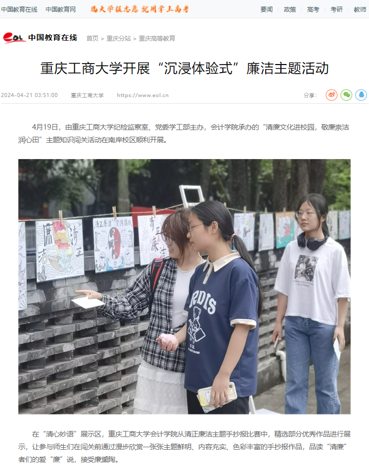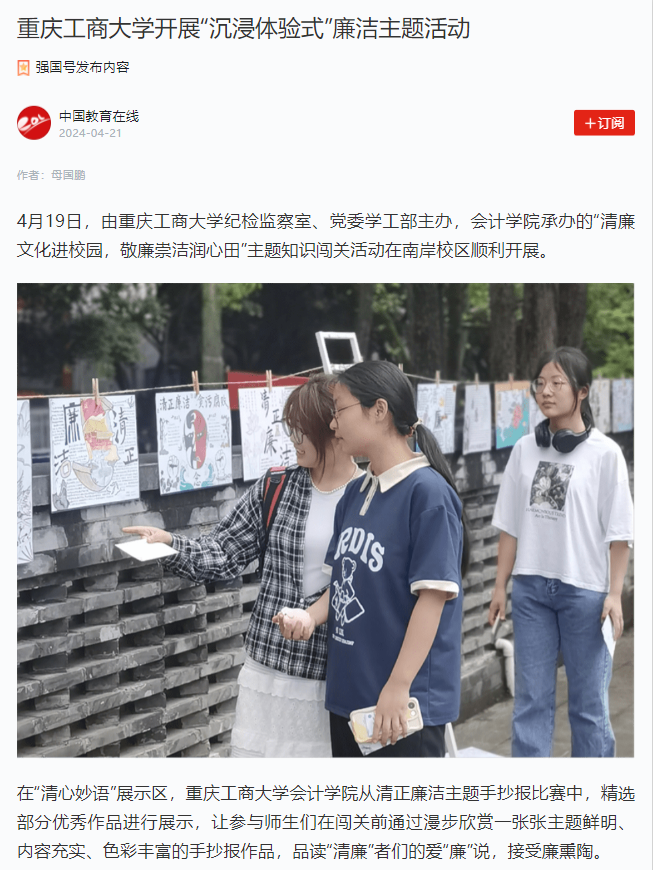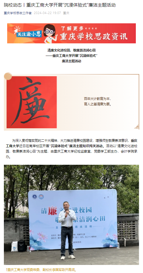 当前位置: 首页 >> 社区建设 >> 社区风采 >> 正文 中国教育在线、学习强国平台、重庆学校思政工作者公众号报道我校开展“沉浸体验式”廉洁主题活动 时间:2024年04月24日 11:00 作者: 4月19日,由ok138cn太阳集团纪检监察室、党委学工部主办,会计学院承办的“清廉文化进校园,敬廉崇洁润心田”主题知识闯关活动在ok138cn太阳集团南岸校区顺利开展,中国教育在线、学习强国平台、重庆学校思政工作者公众号对此进行了报道。 原文链接: 中国教育在线:https://chongqing.eol.cn/cqgd/202404/t20240421_2599976.shtml 学习强国平台:https://article.xuexi.cn/articles/index.html?art_id=6445075589101610860&item_id=6445075589101610860&study_style_id=feeds_opaque&pid=&ptype=-1&source=share&share_to=wx_single 重庆学校思政工作者公众号:https://mp.weixin.qq.com/s/kS169I78wgdWude3Iwg2UQ?version=4.1.22.6014&platform=win 上一条:公共管理学院共学社区“寸心寄华夏,五四漾韶华”第二期板凳会顺利举行 下一条:“寓”见美好,共筑安全防线——数学与统计学院携手保卫处、学生处打造平安校园游园盛会 【关闭】