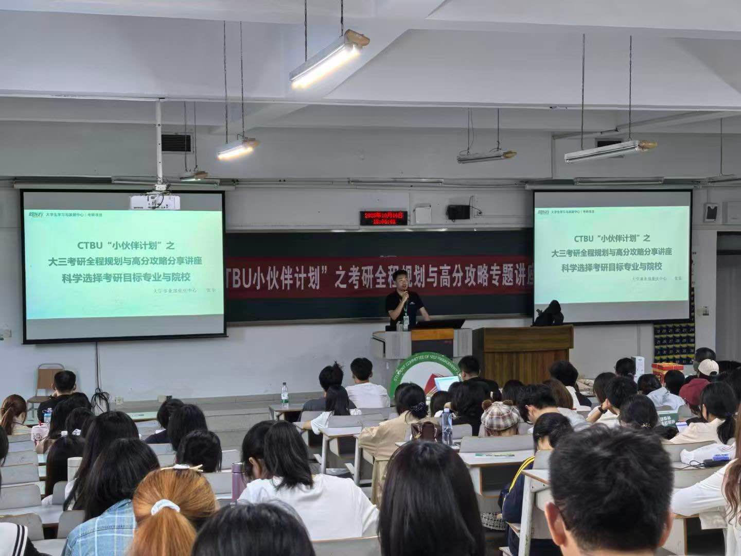 当前位置: 首页 >> 社区建设 >> 社区风采 >> 正文 聚焦考研核心需求!CTBU“小伙伴计划”专题讲座为150余名学子赋能! 时间:2025年10月17日 14:30 作者: 大学生自我管理与服务委员会学业促进部 由大学生自我管理与服务委员会学业促进部联合新东方统筹举办的CTBU“小伙伴计划”之大三考研全程规划与高分攻略专题讲座,已于2025年10月16日18:00在南岸校区博智楼07322圆满落幕,活动累计吸引150余名学生参与,整体反响热烈、成效显著。 本次讲座紧扣大三学生考研备考核心需求,从“解困惑、传方法、强信心”三个维度设计内容:一方面,特邀新东方明星讲师张乐(专注考研英语教学16年,累计授课超2万小时,助力5000+学员提分)主讲,既结合最新考研趋势拆解“专业匹配度+地域竞争力”的科学择校逻辑,帮学生避开盲目选校误区,又针对英语、数学、政治三大核心科目,深入讲解高效复习方法与真题命题思维,重点攻克词汇、长难句、阅读等备考难点,为学生搭建从0到1的系统复习框架;另一方面,特别安排我校考研学长分享真实备考心路,通过案例复盘与避坑技巧传递,让学生直观了解备考关键节点,缓解考研的焦虑。 此次活动不仅落实了“小伙伴计划”助力学生学业发展的初衷,也为后续开展同类专题指导积累了经验。后续学业促进部将持续跟进学生备考需求,结合本次反馈优化服务细节,进一步为学生考研备考提供精准支持,不辜负领导老师的信任与期望。 上一条:体育学院 “一站式”学生社区举办“初见惊鸿,青春启航”校园公益主题活动 下一条:诗影诉家国 文思展情怀——文学与新闻学院“一站式”学生社区“诗影双节”主题活动圆满落幕 【关闭】